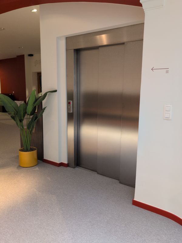 - Met de lift kan je van het gelijkvloers naar de 1e of de 2e verdieping voor de zaal of De Foyer.